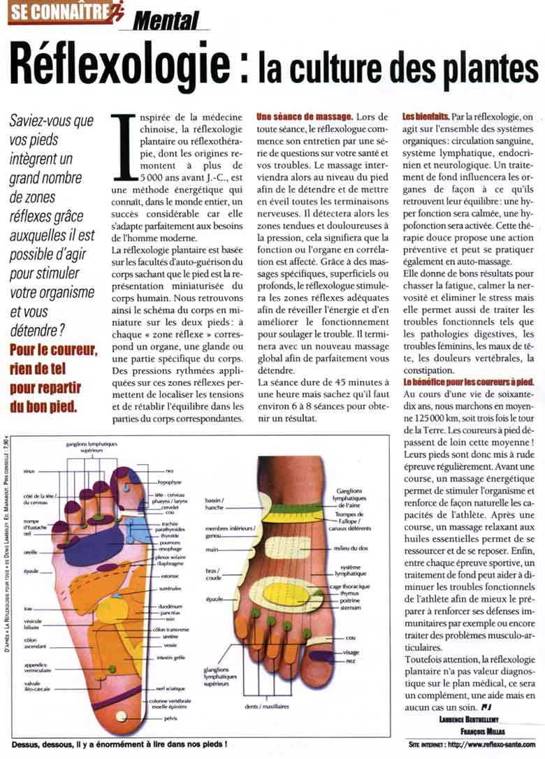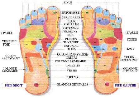Les pieds sont une région de grande sensibilité qui forment une zone réflexe très importante. Chaque partie du pied est en relation, par l'intermédiaire du système nerveux, avec les organes du corps, selon une topographie bien précise, si bien qu'une stimulation d'un point réflexe du pied entraîne instantanément la stimulation de l'organe correspondant.